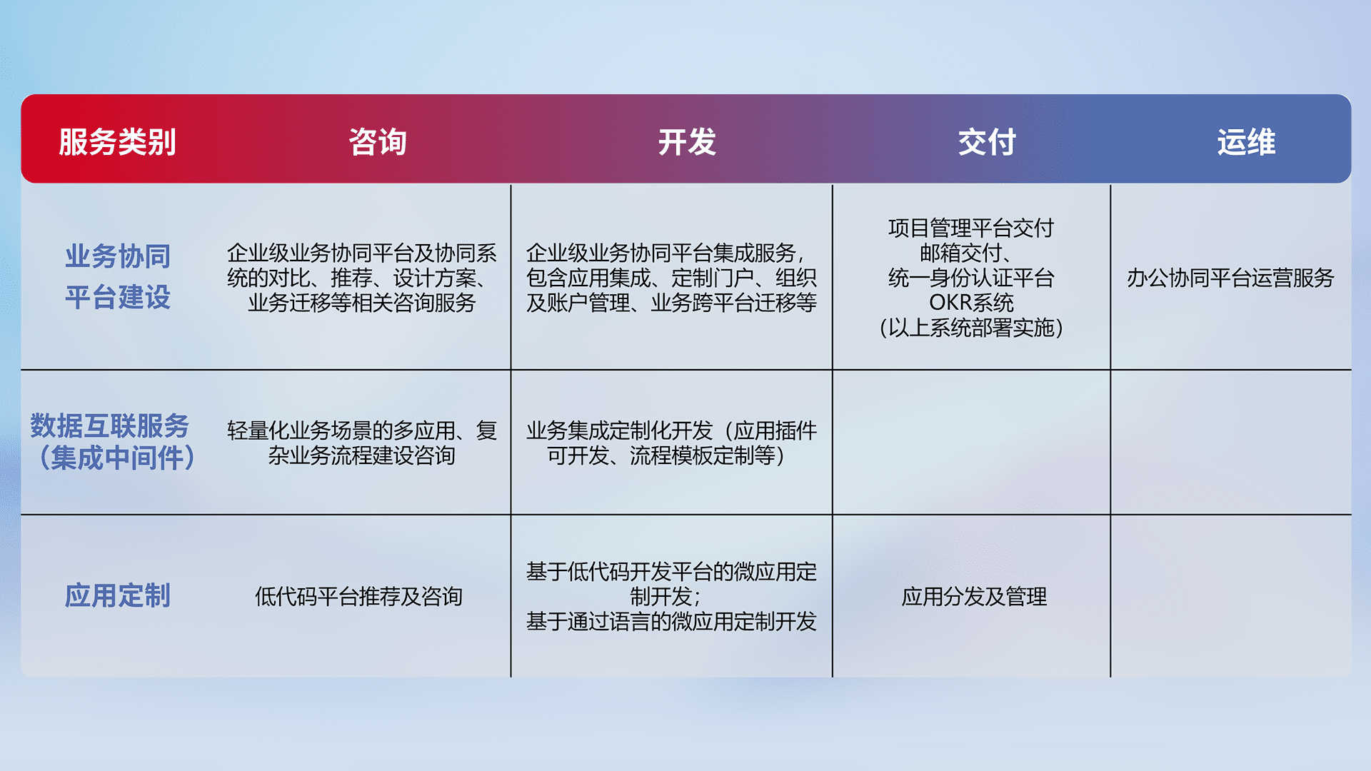 针对钉钉、、、、企微、、、IDaas等平台级产品提供产品的规划、、、、方案、、、、交付、、定制化开发等服务,,,,实现如统一协同办公、、、智能客户服务、、混合会议管理、、智能数据查询、、等业务场景,,,实现数字化转型。。。